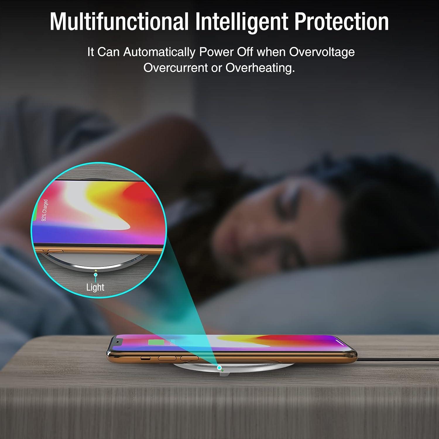 【Sleep-Friendly LED Indicator and Safe to Use】The wireless charger will light up blue for 10 seconds and then turn off during charging, quietly uses LED lights to display charge status, allowing undisturbed sleep with no notification sounds.With built-in protections against over-voltage, over-temperature, over-current, short-circuit, and other potential hazards, it keeps your device's battery safe from overcharge damage.