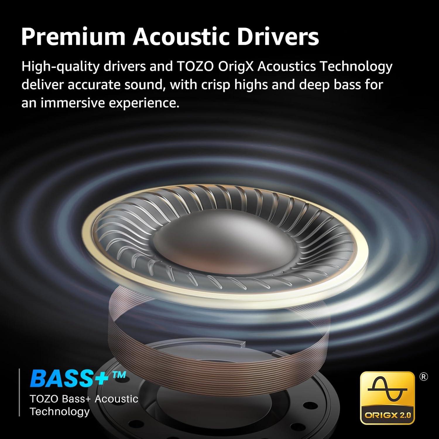 [Immersive Stereo Sound] TOZO Crystal Pods have oversized 10mm drivers and an exclusive OrigX Acoustic 2.0 sound technology that deliver powerful bass and delicate treble, bringing you into an immersive musical feast.