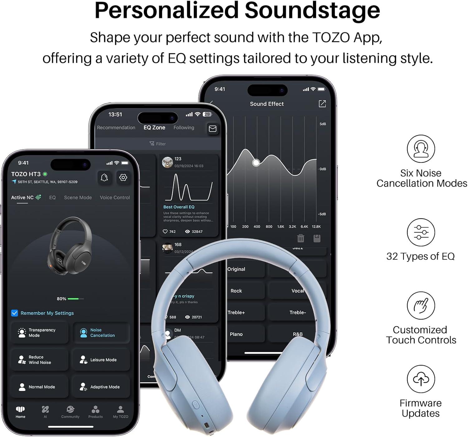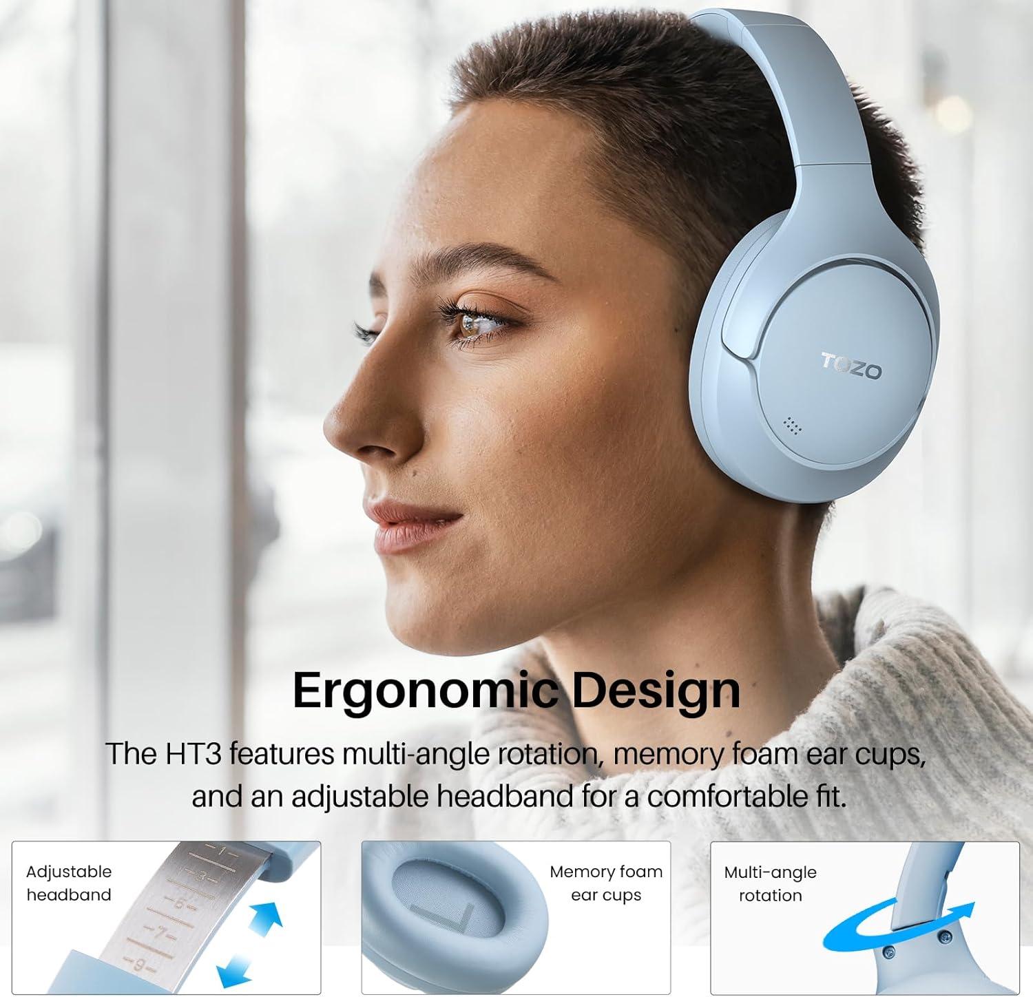 [All-day Comfort & Adjustable Design] TOZO HT2 uses ultra-soft protein leather earcups, which allows you to wear it for a long time without feeling uncomfortable. The earmuffs can also automatically adjust the angle to suit users with different head shapes. Making them the ideal headphones to work from home or watch your favorite movie.