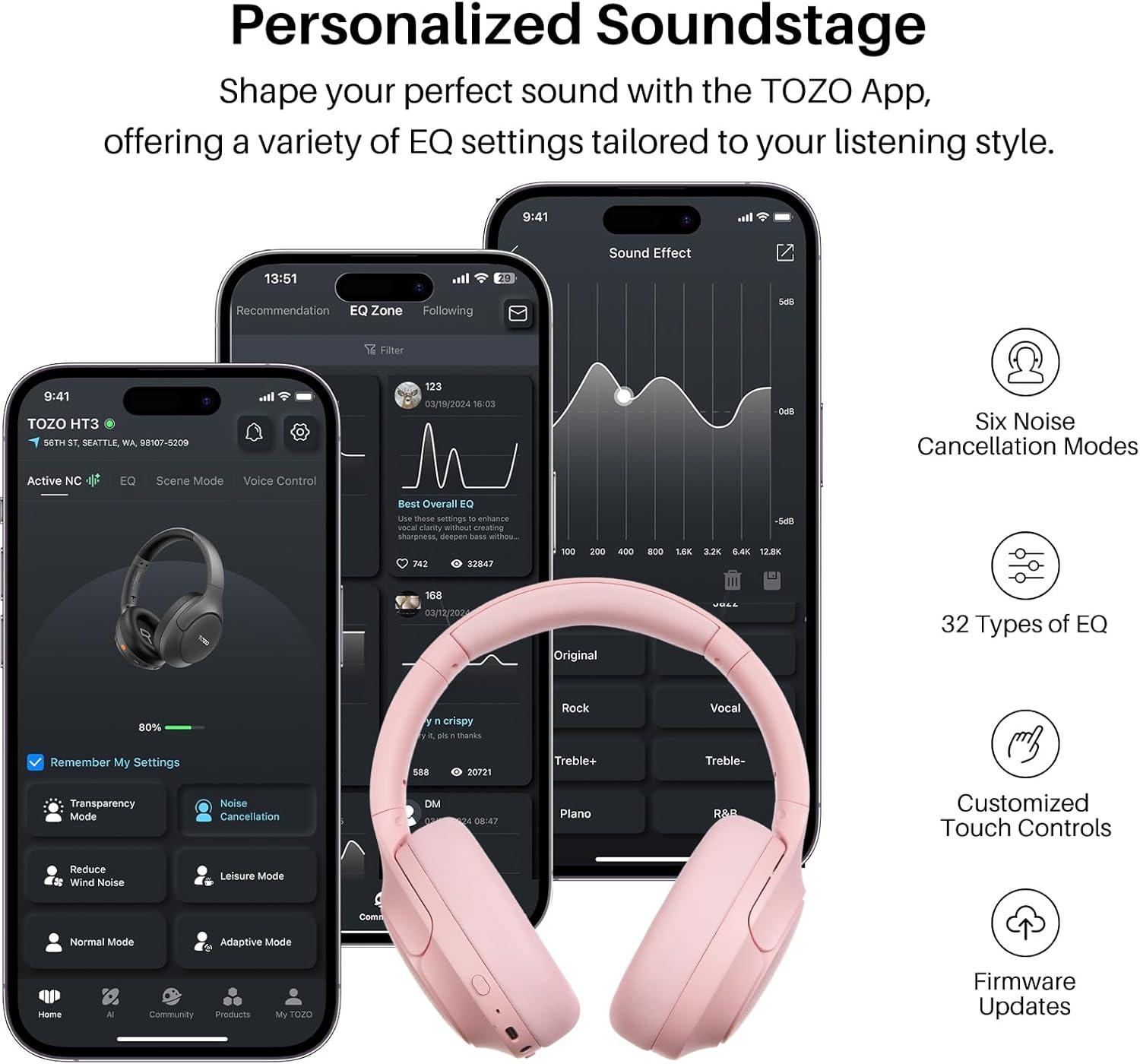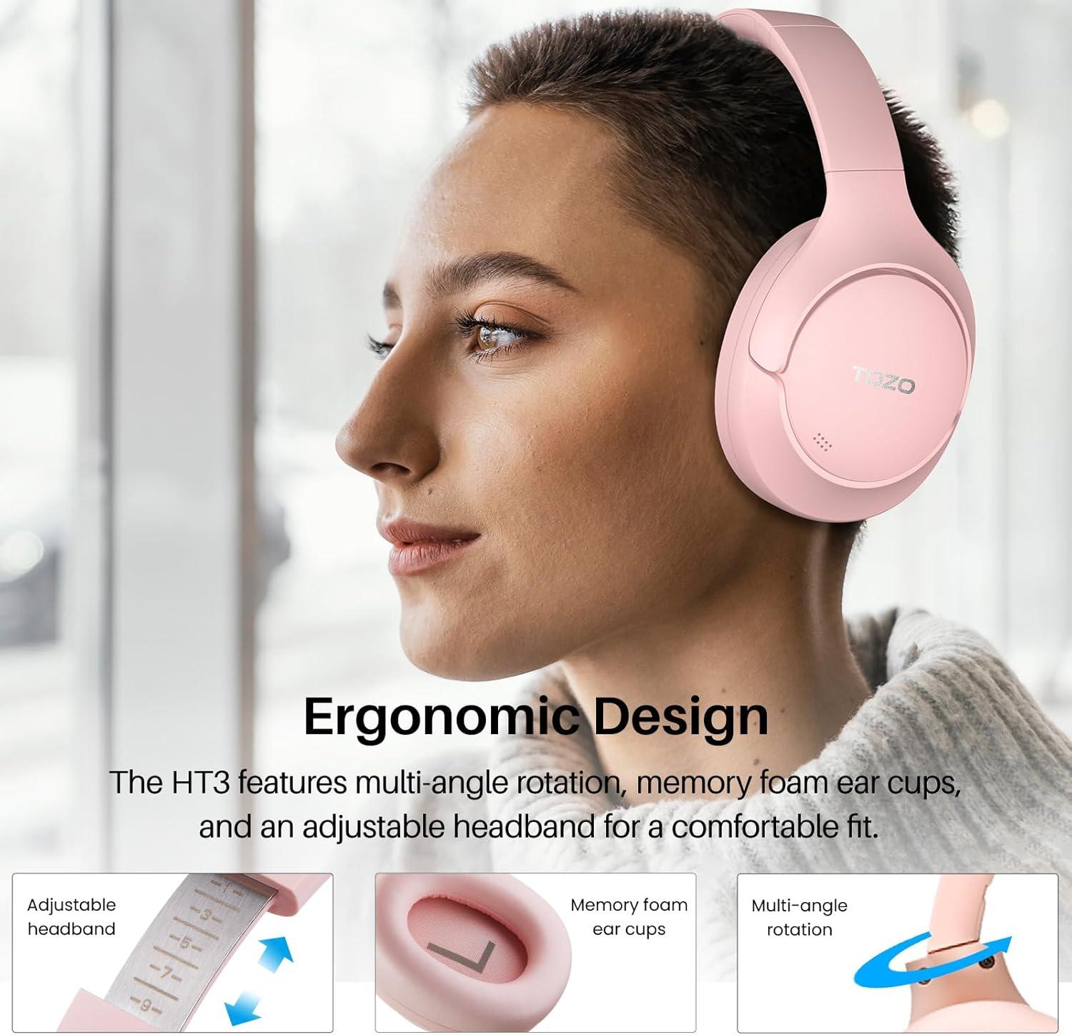 TOZO HT2 Hybrid Active Noise Cancelling Headphones, Wireless Over Ear Bluetooth Headset, 60H Playtime, Hi-Res Audio Custom EQ via App Deep Bass Comfort Fit Ear Cups, for Home Office Travel Blue(Pink)