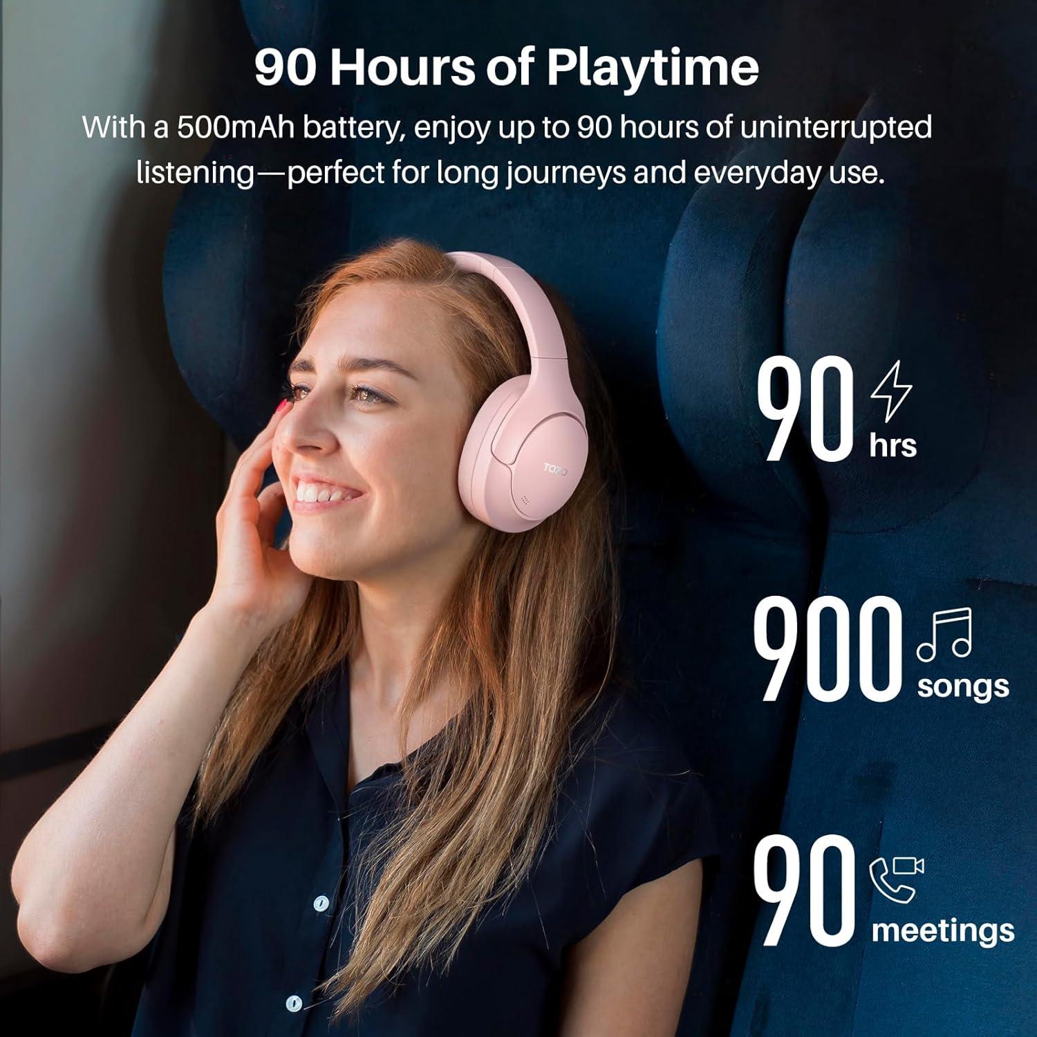 TOZO HT3 Hybrid Noise Cancelling Headphones, 90H Playtime Wireless Over Ear Bluetooth Headset, Spatial Audio AI Chat with 5 Mics, Supports Dual Connection and USB-C Input, with 32 EQ Music Modes(Pink)