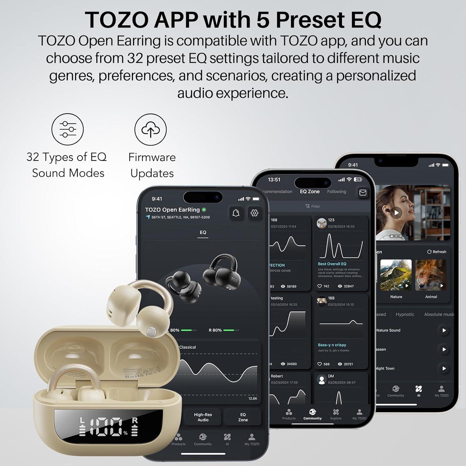 [CUSTOMIZE YOUR OWN EQ] – With TOZO APP to customize your favorite EQ mode, allowing you to listen to various vocal music more accurately, such as jazz, blues, classical music, etc. Let's start your own music festival with TOZO OpenEarRing!