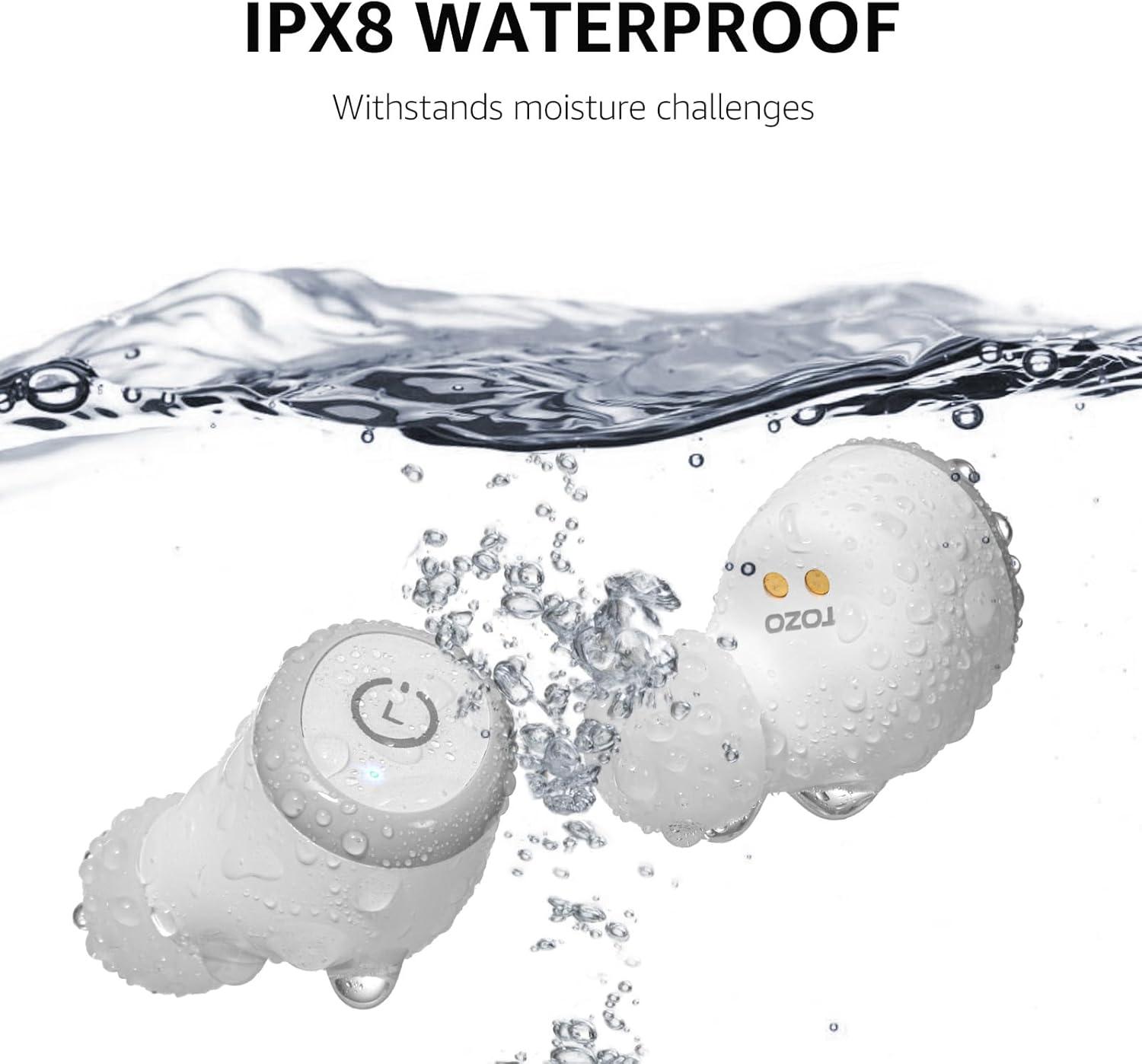 [IPX8 Waterproof] TOZO T10 wireless earbuds feature an IPX8 waterproof rating nano-coating on their internal components, providing solid protection against sweat and raindrops effectively, thereby extending the earbuds' lifespan, which are suitable for running, swimming, cycling and other various sports.