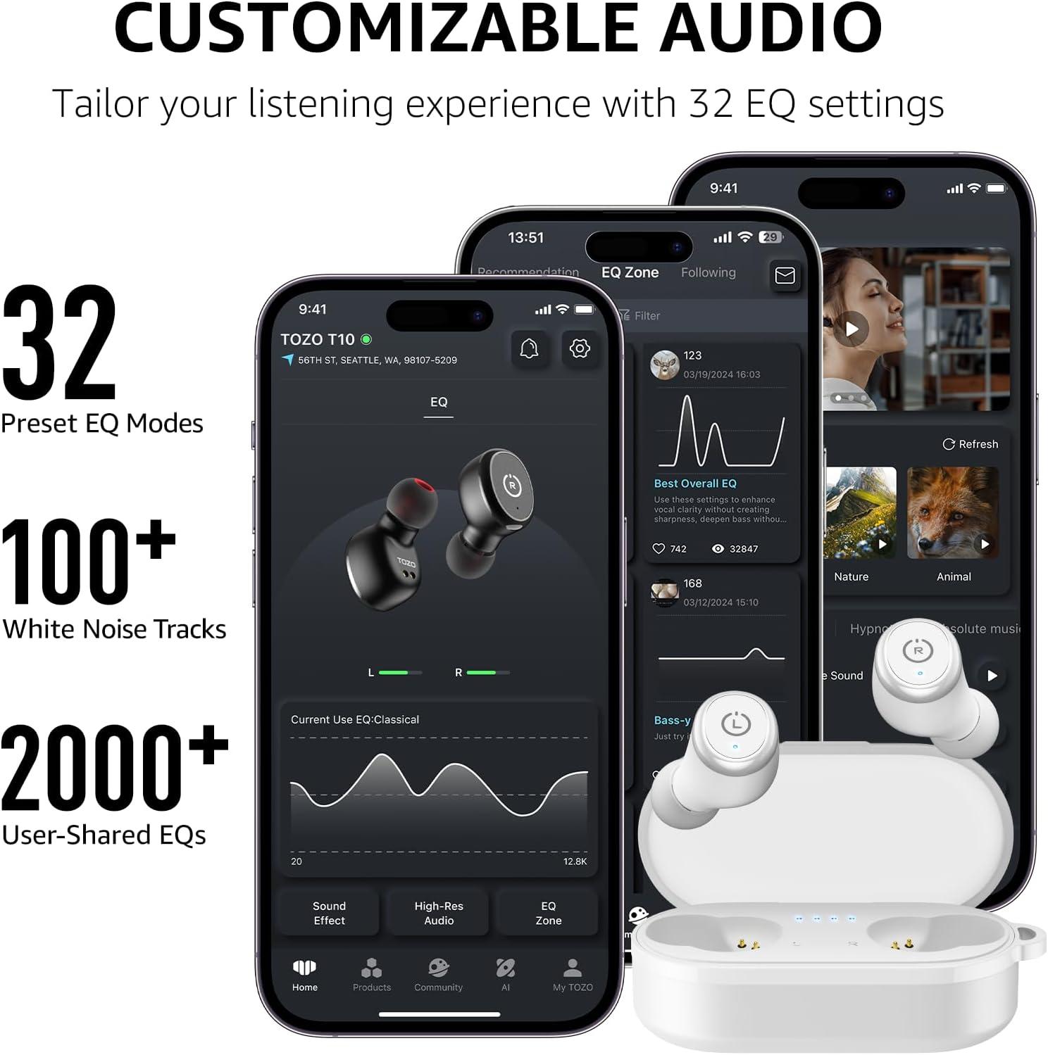 [Customize EQ with TOZO App] Compatible with TOZO App, you can freely switch between 32 EQ modes and explore various styles of music. Personalize your listening experience by adjusting specific frequencies to bring you an auditory feast, plus you can adjust the touch settings yourself.