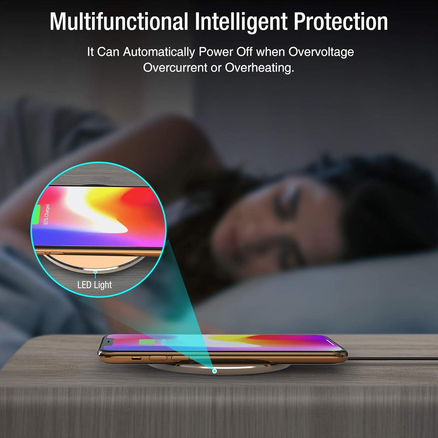 【Sleep-Friendly LED Indicator and Safe to Use】The wireless charger will light up blue for 10 seconds and then turn off during charging, quietly uses LED lights to display charge status, allowing undisturbed sleep with no notification sounds.With built-in protections against over-voltage, over-temperature, over-current, short-circuit, and other potential hazards, it keeps your device's battery safe from overcharge damage.